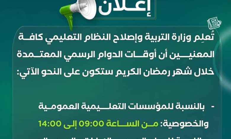 ووفقاً للإعلان الصادر عن الوزارة، فقد تقرر توحيد توقيت الدراسة في جميع المؤسسات التعليمية، سواء كانت عمومية أو خصوصية، لتبدأ من الساعة التاسعة صباحاً وحتى الساعة الثانية ظهراً طيلة أيام الشهر الكريم.