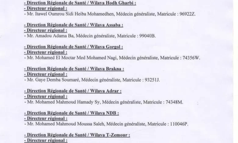 وشملت المذكرة تعيينات جديدة في ولايات الحوض الغربي، لعصابة، كوركل، البراكنة، آدرار، داخلت نواذيبو، تيرس الزمور، وإينشيري، حيث تم اختيار كفاءات من الأطباء العامين لتولي هذه المهام.