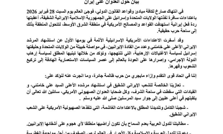 وأوضح البيان أن ما تتعرض له إيران حالياً يمثل حلقة ضمن مسلسل تآمري يستهدف كافة دول المنطقة دون استثناء، مشيراً إلى أن أمن كل دولة بات مهدداً، وأن توقيت استهدافها يعتمد على نتائج المواجهة الحالية فوق الأراضي الإيرانية.